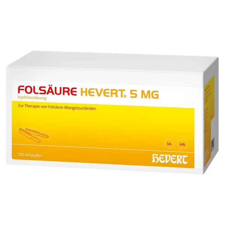 Folsäure Hevert 5 mg. Anwendungsgebiete: Prophylaxe und Therapie von Folsäuremangelzuständen, wenn eine orale Folsäuresubstitution nicht möglich oder die rasche Behebung eines ausgeprägten Mangelzustands dringend erforderlich ist. Zu Risiken und Nebenwirkungen lesen Sie die Packungsbeilage und fragen Sie Ihre Ärztin, Ihren Arzt oder in Ihrer Apotheke.