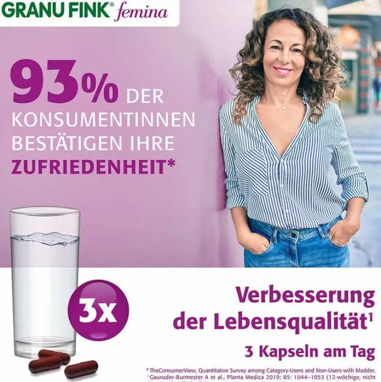 GRANU FINK® femina Anwendungsgebiete: Traditionelles pflanzliches Arzneimittel zur Anwendung bei erwachsenen Frauen zur Stärkung oder Kräftigung der Blasenfunktion bei Blasenschwäche und zur Linderung von Blasenbeschwerden durch hyperaktive Blase (Reizblase), nachdem schwerwiegende Erkrankungen durch einen Arzt ausgeschlossen wurden, ausschließlich auf Grund langjähriger Anwendung. Bei fortdauernden Krankheitssymptomen oder beim Auftreten anderer als der in der Packungsbeilage erwähnten Nebenwirkungen sollten Sie einen Arzt oder eine andere in einem Heilberuf tätige qualifizierte Person konsultieren. Enthält Sojaöl und Glucose. Packungsbeilage beachten. Zu Risiken und Nebenwirkungen lesen Sie die Packungsbeilage und fragen Sie Ihre Ärztin, Ihren Arzt oder in Ihrer Apotheke. Stand: März 2024