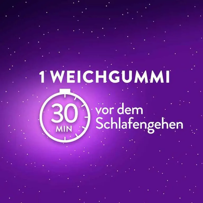 Nehmen Sie 30 Minuten vor dem Zubettgehen einen Weichgummi ein und ermöglichen Sie mindestens 6 Stunden Schlaf. Ab 12 Jahren.
