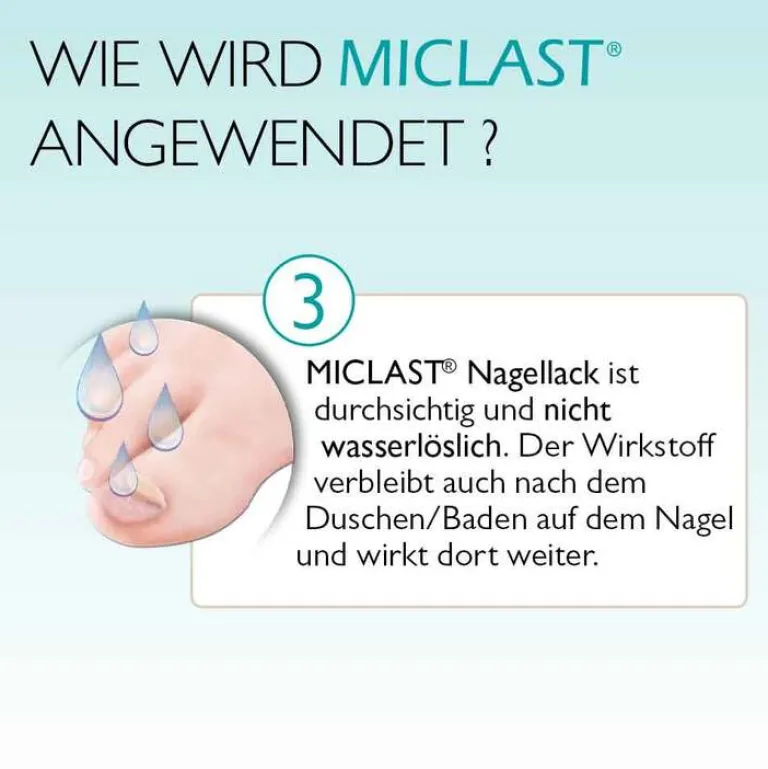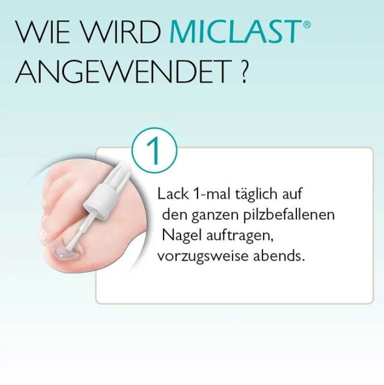MICLAST® 80 mg/g wirkstoffhaltiger Nagellack. Wirkstoff: Ciclopirox. Anwendungsgebiet: Behandlung von leichtem bis mittelschwerem Nagelpilz-Befall (Onychomykose) der Finger- und Zehennägel. Der Wirkstoff Ciclopirox dringt in den Nagel ein und tötet die Pilze ab. Zu Risiken und Nebenwirkungen lesen Sie die Packungsbeilage und fragen Sie Ihre Ärztin, Ihren Arzt oder in Ihrer Apotheke.