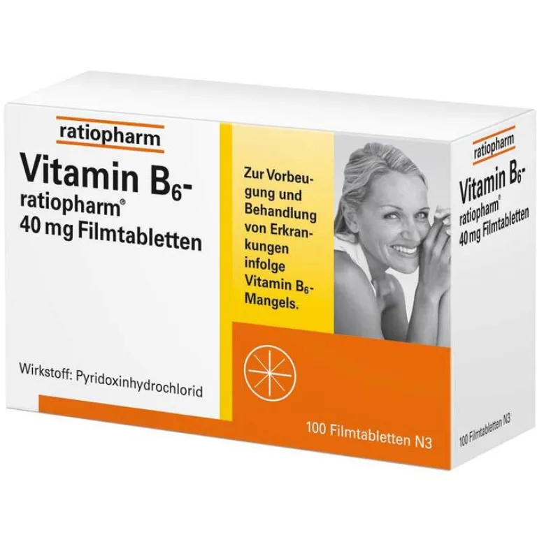 Vitamin-B6-ratiopharm® 40 mg Filmtabletten. Wirkstoff: Pyridoxinhydrochlorid. Anwendungsgebiete: Erwachsene: Vorbeugung und Behandlung einer peripheren Neuropathie infolge medikamenteninduzierten Vitamin-B6-Mangels. Behandlung von pyridoxinabhängigen Störungen. Kinder und Jugendliche: Behandlung einer peripheren Neuropathie infolge medikamenten-induzierten Vitamin-B6-Mangels. Erhaltungstherapie nach Vitamin-B6-Mangel bedingten Krämpfen bei Neugeborenen und Säugl.. Behandlung von pyridoxinabhängigen Störungen bei Kindern über 1 Jahr. Warnhinweis: Filmtabl. enthalten Lactose. Apothekenpflichtig. Zu Risiken und Nebenwirkungen lesen Sie die Packungsbeilage und fragen Sie Ihre Ärztin, Ihren Arzt oder in Ihrer Apotheke. 7/13