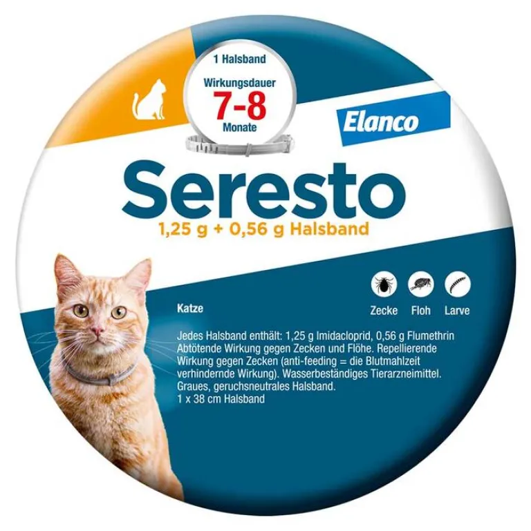 Seresto® 1,25 g + 0,56 g Halsband für Katzen. Anwendungsgebiete: Zur Behandlung und Vorbeugung eines Flohbefalls (Ctenocephalides felis) mit einer Wirkungsdauer von 7 bis 8 Monaten. Das Tierarzneimittel verhindert die Entwicklung von Flohlarven in der unmittelbaren Umgebung des Tieres für 10 Wochen. Das Tierarzneimittel kann als Teil der Behandlungsstrategie bei durch Flohstiche ausgelöster allergischer Hautentzündung (Flohallergiedermatitis, FAD) angewendet werden. Das Tierarzneimittel hat eine anhaltend akarizide (abtötende) Wirkung gegen Zeckenbefall mit Ixodes ricinus und Rhipicephalus turanicus und repellierende (anti-feeding = die Blutmahlzeit verhindernde) Wirkung gegen Zeckenbefall mit Ixodes ricinus, mit einer Wirkungsdauer von 8 Monaten. Das Tierarzneimittel ist wirksam gegen Larven, Nymphen und adulte Zecken. Es ist möglich, dass Zecken, die zum Zeitpunkt der Behandlung bereits an der Katze vorhanden sind, nicht innerhalb der ersten 48 Stunden nach Anlegen des Halsbandes getötet werden und angeheftet und sichtbar bleiben. Deshalb sollten die Zecken, die zum Behandlungszeitpunkt bereits auf der Katze befindlich sind, entfernt werden. Der Schutz vor Befall mit neuen Zecken beginnt innerhalb von zwei Tagen nach Anlegen des Halsbandes. Zu Risiken und Nebenwirkungen lesen Sie die Packungsbeilage und fragen Sie Ihren Tierarzt oder Apotheker. Apothekenpflichtig. Zulassungsinhaber: Elanco GmbH, Heinz-Lohmann-Straße 4, 27472 Cuxhaven, Deutschland Druckversion: 03/2021