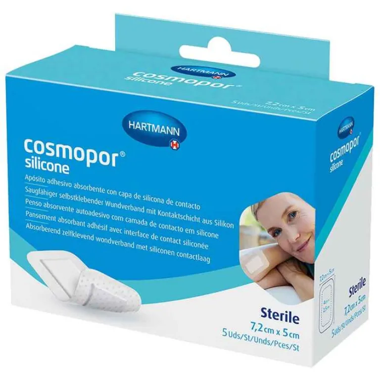 Cosmopor® silicone ist ein steriler Wundschnellverband, der sich dank einer hautfreundlichen perforierten Silikon-Haftschicht sanft entfernen lässt. Er verklebt nicht mit der Wunde oder chirurgischen Nähten, bietet aber trotzdem starken Halt. Der Wundschnellverband ist anschmiegsam und polsternd, atmungsaktiv und zugleich wasserabweisend. Außerdem verfügt Cosmopor® silicone über ein hohes Saugvermögen und eine hohe Retentionsleistung. Das Viskose-Wundkissen nimmt Wundsekret auf und leitet es zu den Superabsorber-Fasern weiter. Dort wird das Exsudat dauerhaft eingeschlossen, sodass es nicht mehr in die Wunde zurückgelangen kann.