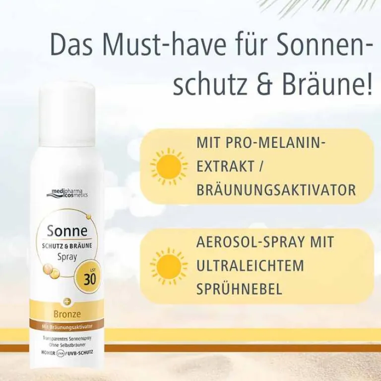 Das ultraleichte und transparente Sonnenspray Schutz & Bräune mit LSF 30 von Medipharma Cosmetics ist für Gesicht und Körper geeignet und bietet Sicherheit und Hautschutz auch bei intensiver Sonneneinstrahlung.