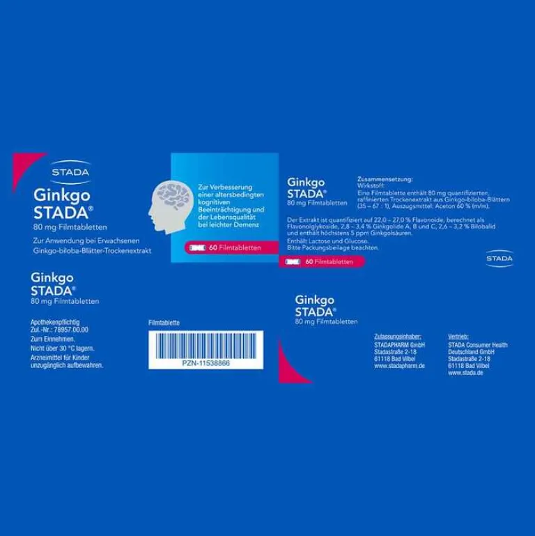 Ginkgo STADA® 80 mg Filmtabletten. Zur Anwendung bei Erwachsenen. Wirkstoff: Ginkgo-biloba-Blätter-Trockenextrakt. Ginkgo STADA® ist ein pflanzliches Arzneimittel zur Verbesserung einer altersbedingten kognitiven Beeinträchtigung und der Lebensqualität bei leichter Demenz. Enthält Lactose und Glucose. Zu Risiken und Nebenwirkungen lesen Sie die Packungsbeilage und fragen Sie Ihre Ärztin, Ihren Arzt oder in Ihrer Apotheke. Zulassungsinhaber: STADAPHARM GmbH, Stadastraße 2–18, 61118 Bad Vilbel. Vertrieb: STADA Consumer Health Deutschland GmbH, Stadastraße 2–18, 61118 Bad Vilbel. Stand: Juli 2020