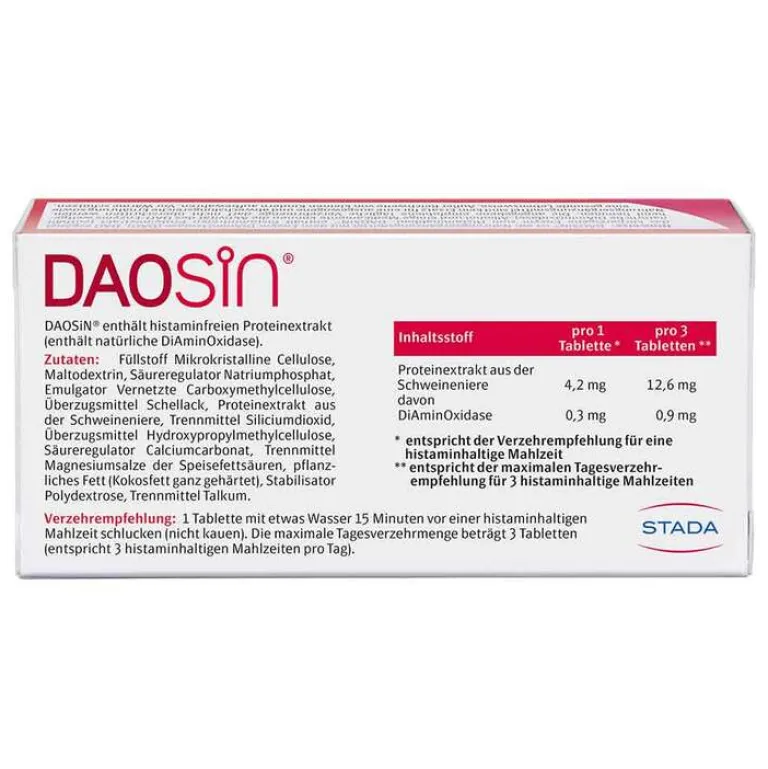 Nehmen Sie Daosin unbedingt – im Idealfall ca. 15 Minuten – vor einer Mahlzeit mit etwas Wasser ein. Die maximale Tagesverzehrmenge beträgt 3 Tabletten.