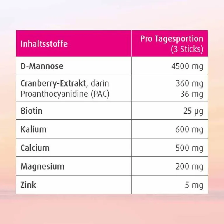 Neben 4,5 g aus der Birke gewonnene D-Mannose enthält sie das wasserlösliche Vitamin Biotin, einen Zink-Mineralstoff-Komplex sowie Cranberry-Extrakt, der aufgrund seiner sekundären Pflanzenstoffe (Proanthocyanidine, kurz PAC) besonders geschätzt wird.