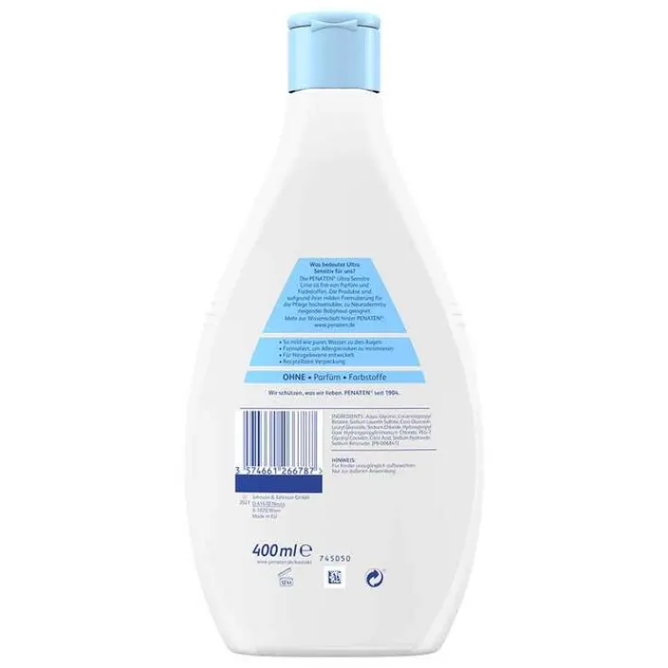 Die Penaten ultra sensitiv Linie ist frei von Parfüm und Farbstoffen. Die Produkte sind aufgrund ihrer milden Formulierung daher besonders gut für die Pflege hochsensibler, zu Neurodermitis neigender Babyhaut geeignet.