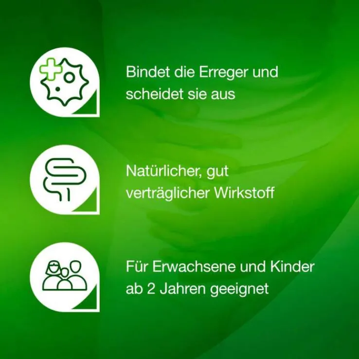 - Das Arzneimittel bindet die Durchfallerreger und unterstützt Ihren Darm dabei, die Erreger auszuscheiden. Dies trägt zur sanften Linderung der Beschwerden bei.