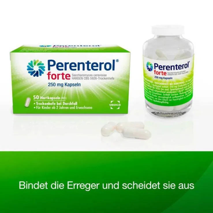 Perenterol® forte 250 mg Kapseln. Wirkstoff: Trockenhefe aus Saccharomyces cerevisiae HANSEN CBS 5926 (Synonym: Saccharomyces boulardii). Anwendungsgebiete: Zur Behandlung der Beschwerden bei akuten Durchfallerkrankungen, zur Vorbeugung und Behandlung der Beschwerden von Reisedurchfällen sowie Durchfällen unter Sondenernährung. Zur begleitenden Behandlung bei länger bestehenden Formen der Akne. Für Erwachsene und Kinder ab 2 Jahren. Warnhinweis: Enthält Lactose. Zu Risiken und Nebenwirkungen lesen Sie die Packungsbeilage und fragen Sie Ihre Ärztin, Ihren Arzt oder in Ihrer Apotheke.Stand: 08/2024. MEDICE Arzneimittel, 58638 Iserlohn.