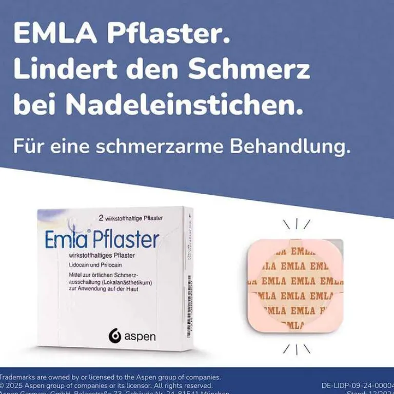 EMLA® Pflaster, wirkstoffhaltiges Pflaster (Wirkstoffe: Lidocain, Prilocain) Anwendungsgebiete: Bei Erwachsenen, Jugendlichen und Kindern: Betäubung der Haut vor a) einem Nadeleinstich, z. B. bei einer Injektion oder Blutabnahme; b) kleineren operativen Eingriffen an der Haut. Warnhinweise: Enthält Macrogolglycerolhydroxystearat. Stand: 12/2023 Aspen Pharma Trading Limited, 3016 Lake Drive, Citywest Business Campus, Dublin 24, Irland. Mitvertrieb: Aspen Germany GmbH, Balanstraße 73, 81541 München, Medical Hotline: +49 30 56 79 68 62 Email: [email protected] Zu Risiken und Nebenwirkungen lesen Sie die Packungsbeilage und fragen Sie Ihre Ärztin, Ihren Arzt oder in Ihrer Apotheke.