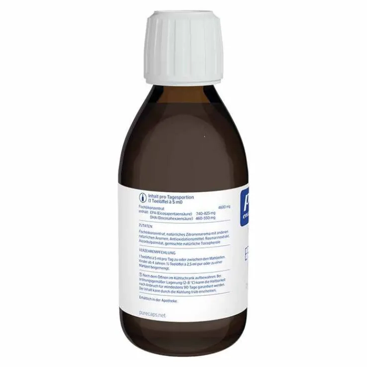 EPA/DHA liquid ist hoch dosiert und liefert die standardisiertenOmega-3-Fettsäuren EPA (Eicosapentaensäure) und DHA (Docosahexaensäure) in einer geschmacksneutralen Form. Die essentiellen Fettsäuren weisen herzschützende Eigenschaften* auf und tragen zur Aufrechterhaltung eines normalen Blutdrucks* bei. Omega-3-Fettsäuren sind zudem wichtige Bausubstanzen der Myelinscheiden.