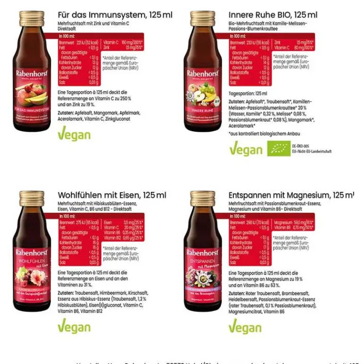 Beste Wünsche: Weißer Trauben-, Apfel-, Birnen-, Kirsch-, Aronia-, Holunder-, Heidelbeer-, Granatapfel-, Cranberry-, Brombeer-, schwarzer Johannisbeersaft, Vitamin D3, Vitamine B1, B2, B6, B12, C, E, Niacin, Pantothenat, Biotin, Provitamin A.