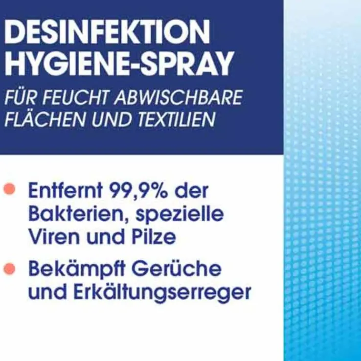 Keime können auf Oberflächen lange überleben. Gerade auf nicht waschbaren Wohntextilien wie Polstermöbel, Matratzen oder Kopfkissen können sich Keime in großer Anzahl befinden. Einfach aufgesprüht, beseitigt das Sagrotan® Hygiene-Spray (Aerosol) dank spezieller Formulierung 99,9% der Bakterien, Pilze und spezielle Viren nun auch von Wohntextilien. Gleichzeitig entfernt es unangenehme Gerüche.