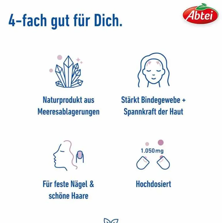 Abtei Kieselerde Intensiv – die Geheimwaffe für eine Stärkung des Bindegewebes, verbesserte Spannkraft der Haut sowie mehr Festigkeit von Haaren und Nägeln.