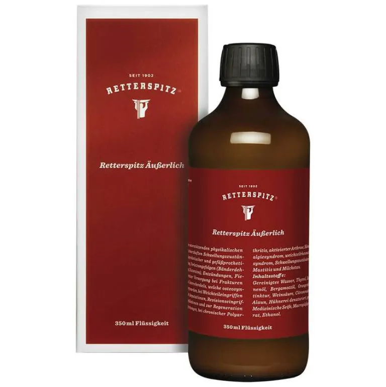 Retterspitz® Äußerlich ist ein rein pflanzliches Naturheilmittel und wird aus der Gebirgspflanze Arnika und ätherischen Ölen gewonnen. Es wird als Wickellösung für Wundumschläge sowie Wickel verwendet und kommt zum Beispiel zur Anwendung, um stumpfe Verletzungen, Wunden, Hämatome, Zerrungen, Prellungen oder Verstauchungen zu behandeln und Fieber zu senken.