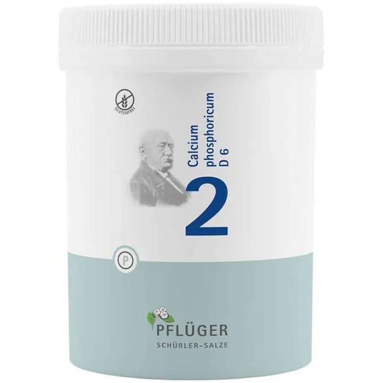 Biochemie Pflüger® Nr. 2 Calcium phosphoricum D6 Zusammensetzung: 1 Tablette enthält: Wirkstoff: Calcium phosphoricum Trit. D6 250 mg. Sonstige Bestandteile: Calciumbehenat (DAB), Kartoffelstärke. Registriertes homöopathisches Arzneimittel, daher ohne Angabe einer therapeutischen Indikation. Gegenanzeigen/Nebenwirkungen: keine bekannt. Enthält Lactose. Packungsbeilage beachten. Zu Risiken und Nebenwirkungen lesen Sie die Packungsbeilage und fragen Sie Ihre Ärztin, Ihren Arzt oder in Ihrer Apotheke. Homöopathisches Laboratorium Alexander Pflüger GmbH & Co. KG · 33378 Rheda-Wiedenbrück · [email protected] · www.pflueger.de