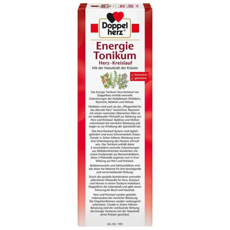 Das Tonikum enthält eine spezielle Kombination wertvoller pflanzlicher Wirkstoffe für Herz, Kreislauf und Nerven. Das Energie Tonikum enthält zwei wertvolle Zubereitungen aus Weißdornfrüchten kombiniert mit einem Extrakt aus Rosmarinblättern. Diese drei Wirkstoffe ergänzen sich in ihrer Wirkung auf Herz und Kreislauf. In Zeiten höherer Belastungen wird die nervenstärkende Wirkung von Baldrian und Melisse besonders geschätzt.