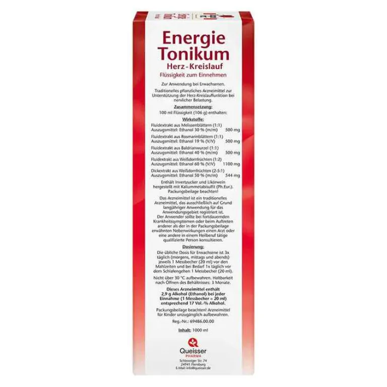 Energie Tonikum Herz-Kreislauf, Flüssigkeit zum Einnehmen. Für Erwachsene. Wirkstoffe: Fluidextrakt aus Melissenblättern, Fluidextrakt aus Rosmarinblätter, Fluidextrakt aus Baldrianwurzel, Fluidextrakt aus Weißdornfrüchten, Dickextrakt aus Weißdornfrüchten. Anwendungsgebiet: Traditionelles pflanzliches Arzneimittel angewendet zur Unterstützung der Herz-Kreislauf-Funktion bei nervlicher Belastung ausschließlich aufgrund langjähriger Anwendung. Warnhinweise: Enthält 17 Vol.-% Alkohol, Invertzuckerlösung und Kaliummetabisulfit (Ph.Eur.). Zu Risiken und Nebenwirkungen lesen Sie die Packungsbeilage und fragen Sie Ihre Ärztin, Ihren Arzt oder in Ihrer Apotheke. Stand 11/2019