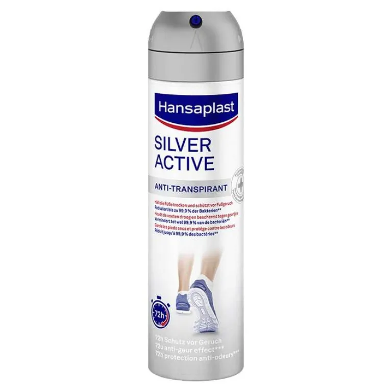 Das Hansaplast Silver Active Fußdeo ist ein Spray, das speziell entwickelt wurde, um unangenehmen Fußgeruch zu verhindern. Mit dem Fußspray werden Füße für 72 Stunden vor Schweiß und Bakterien bewahrt und so ist das Deo ein wirkungsvolles Mittel gegen Schweißfüße. Um die Geruchsbildung zu verhindern, wird mit dem antibakteriellen Aktivkomplex mit Silber-Ionen die Zellmembran der Geruch verursachenden Bakterien zerstört und deren Vermehrung gestoppt. Somit bleiben mit dem Fuß-Antitranspirant Füße langanhaltend frisch. Zudem ist das Fuß Deo frei von Alkohol sowie besonders hautverträglich.