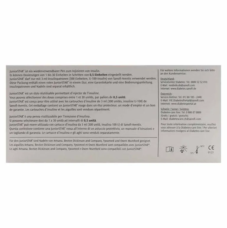 Es können Dosierungen von 1 bis 30 Einheiten in Schritten von 0,5 Einheiten eingestellt werden. JuniorSTAR darf nur mit Lantus, Apidra, Insuman, Insulin lispro Sanofi und Insulin aspart Sanofi* in 3-ml-Insulinpatronen (300 Einheiten, U-100-Insulin) von Sanofi-Aventis verwendet werden. Eine Insulinpatrone enthält Insulin für mehrere Injektionen.