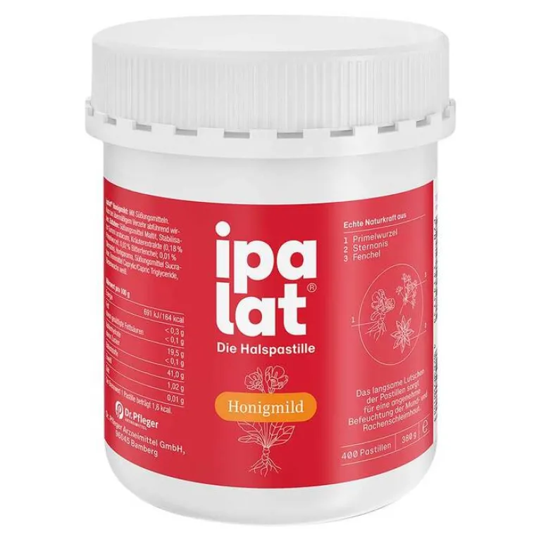 Ipalat Honigmild verbindet die einzigartige echte Naturkraft von Primelwurzel, Anis und Fenchel mit angenehmem, honigmilden Geschmack. Beim Lutschen der Pastille bildet sich ein wohltuender Film im Rachen. Ipalat Honigmild ist Balsam für den Hals.