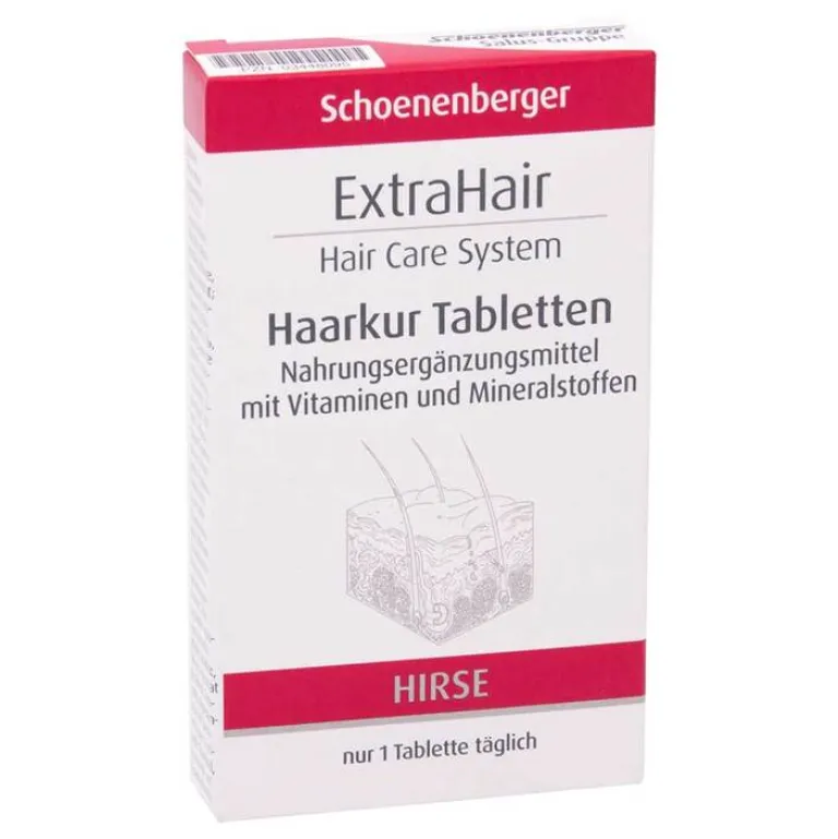 Die ExtraHair Haarkur Tabletten von Schoenenberger unterstützen die natürliche Schönheit Ihrer Haare*, Haarfarbe*, Haut*, Nägel* und Ihres Bindegewebes* mit wertvollen Nährstoffen wie z.B. Biotin, Zink bzw. Kupfer.