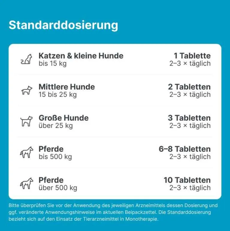 - Pferd, Rind (über 500 kg): 2-3 mal täglich die Einzeldosis von 10 Tabletten