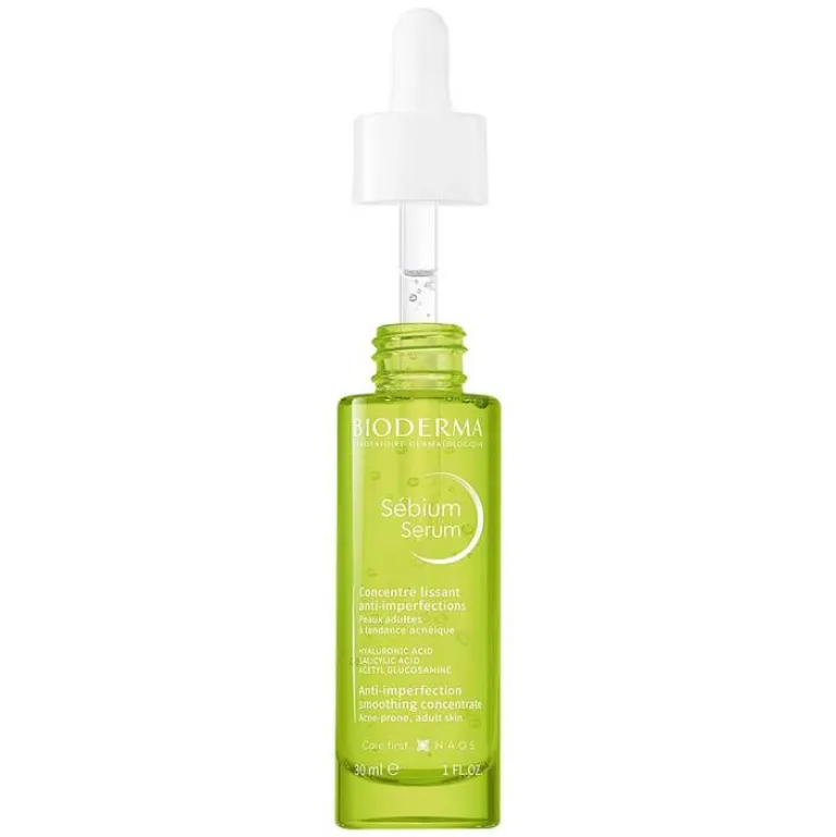 Bioderma Sebium Serum kombiniert die Wirkung gegen Unreinheiten und erste Zeichen der Hautalterung. Hyaluronsäure und Salicylsäure wirken effektiv und langfristig gegen Pickel, Aknemale, erweiterte Poren und feine Falten.