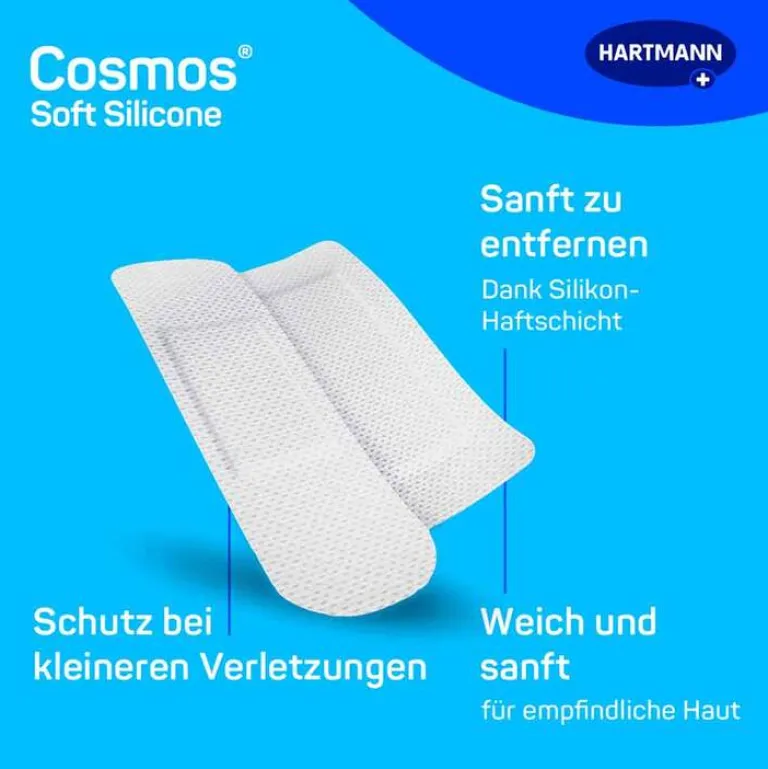 cosmos® soft silicone Pflaster eignen sich zur besonders sanften Wundversorgung selbst bei empfindlicher oder gereizter Haut. Dank des verwendeten Silikonklebers haftet cosmos® soft silicone gut und kann dennoch sanft von der Haut gelöst werden.