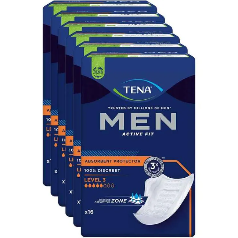 Spezielle Einlagen, die Urin sicher aufsaugen und die Geruchsbildung verhindern, bieten für Betroffene wirksame Soforthilfe. TENA® MEN ACTIVE FIT Level 3 Einlagen sind speziell auf die männliche Anatomie abgestimmt und bieten idealen Schutz bei Nachtröpfeln durch Inkontinenz. Die Protektoren sitzen dank elastischen Seitenbündchen diskret und passgenau in der Unterwäsche und sind daher angenehm zu tragen.