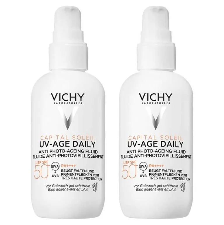 Die Capital Soleil UV-Age Daily LSF 50+ Sonnencreme von Vichy ist ein ultraleichtes Anti-Aging Fluid. Es schützt die Haut zuverlässig vor UVA- und UVB-Strahlen und wirkt sichtbar den Anzeichen der Hautalterung, wie Falten und dunklen Flecken, entgegen.