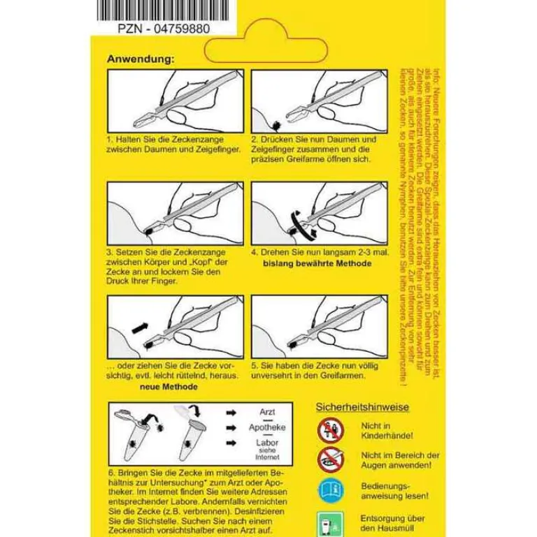 Die Greifarme dieser Zeckenzange sind extra fein und können damit sowohl für grosse, als auch für kleinere Zecken benutzt werden. Sie kann zum Drehen oder Ziehen eingesetzt werden. Ein mitgelieferter Behälter ermöglicht das unproblematische Aufbewahren der entfernten Zecke zur Untersuchung beim einem Arzt oder Apotheker.