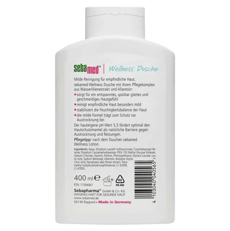 Die Sebamed Wellness Dusche verfügt über einen Pflegekomplex aus Wasserlilienextrakt und Allantoin. Die milde Formel mit einem hauteigenen pH-Wert von 5,5 fördert optimal den Hautschutzmantel als natürliche Barriere gegen Austrocknung und Reizungen. Empfindliche Haut wird besonders mild gereinigt und die Feuchtigkeitsbalance der Haut stabilisiert.