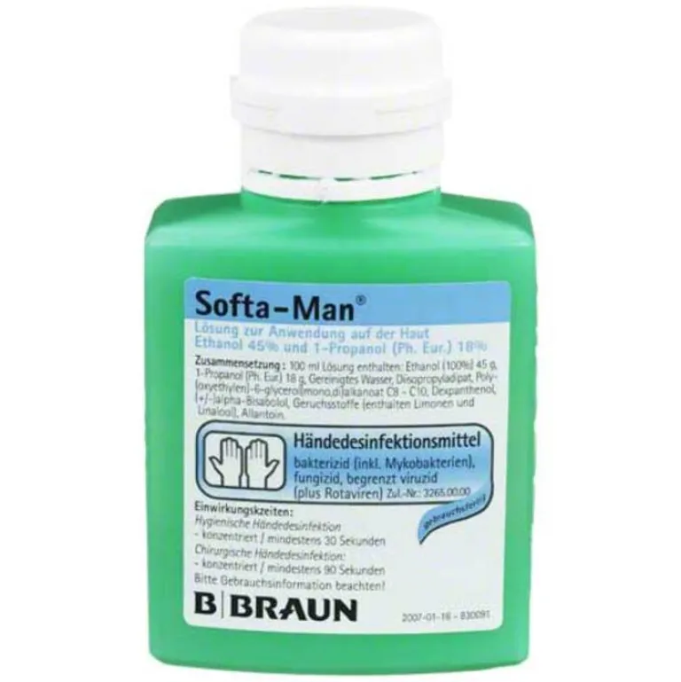 Softa-Man®. Zusammensetzung: 100 ml Lösung enthalten: Wirkstoffe: Ethanol (100%) 45 g, 1-Propanol (Ph. Eur.) 18 g Sonstige Bestandteile: Gereinigtes Wasser, Diisopropyladipat, Macrogol-6-glycerolcaprylocaprat (Ph.Eur.), Dexpanthenol, (+/-)alpha-Bisabolol, Geruchsstoffe (enthalten Limonen und Linalool), Allantoin. Anwendungsgebiete: Hygienische und chirurgische Händedesinfektion. Gegenanzeigen: Überempfindlichkeit (Allergie) gegenüber Ethanol oder 1-Propanol oder einen der sonstigen Bestandteile. Nebenwirkungen: Kontaktallergie. Hautirritationen wie Rötung und Brennen insbesondere bei häufiger Anwendung. Warnhinweise: Entzündlich. Behälter dicht geschlossen halten. Von Zündquellen fernhalten. – Nicht rauchen! Nicht in die Augen bringen. Nicht auf verletzter Haut oder auf Schleimhäuten anwenden. Nur zur äußerlichen Anwendung. 21-22°C Flammpunkt nach DIN 51 755. Stand der Information: 02/2012. Pharmazeutischer Unternehmer: B. Braun Melsungen AG, 34209 Melsungen