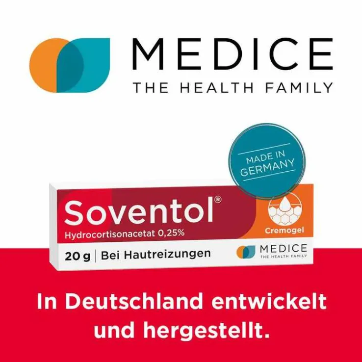 Soventol® Hydrocortisonacetat 0,25% 2,5 mg/g Creme. Anwendungsgebiete: Zur Behandlung von entzündlichen und allergischen Dermatosen (Hautentzündungen und Ekzeme) mit geringer bis mittlerer Symptomausprägung, die auf eine äußerliche Behandlung mit schwach wirksamen Corticosteroiden ansprechen. Zu Risiken und Nebenwirkungen lesen Sie die Packungsbeilage und fragen Sie Ihre Ärztin, Ihren Arzt oder in Ihrer Apotheke. Stand 07/2022. MEDICE Arzneimittel, 58638 Iserlohn