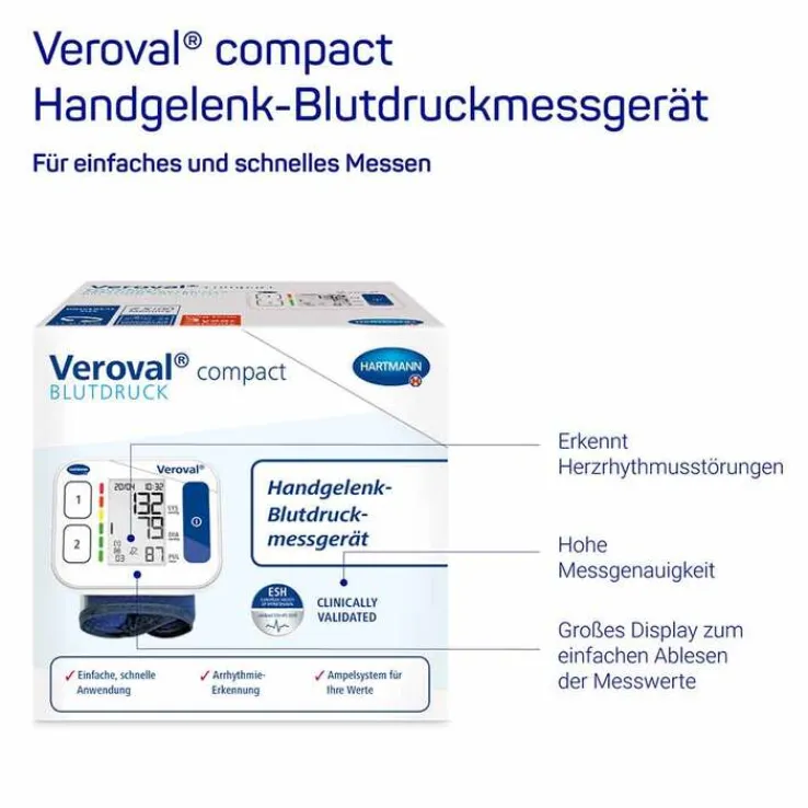 Das Veroval® compact Handgelenk-Blutdruckmessgerät verfügt über eine Erkennung von Herzrhythmusstörungen, die besonders für Hypertoniker wichtig ist.