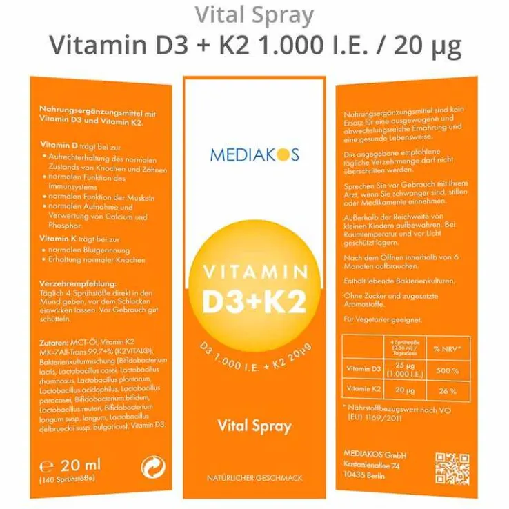 Vitamin D3 + K2 1000 I.E. 20 µg Mediakos Vital Spray, 20 ml