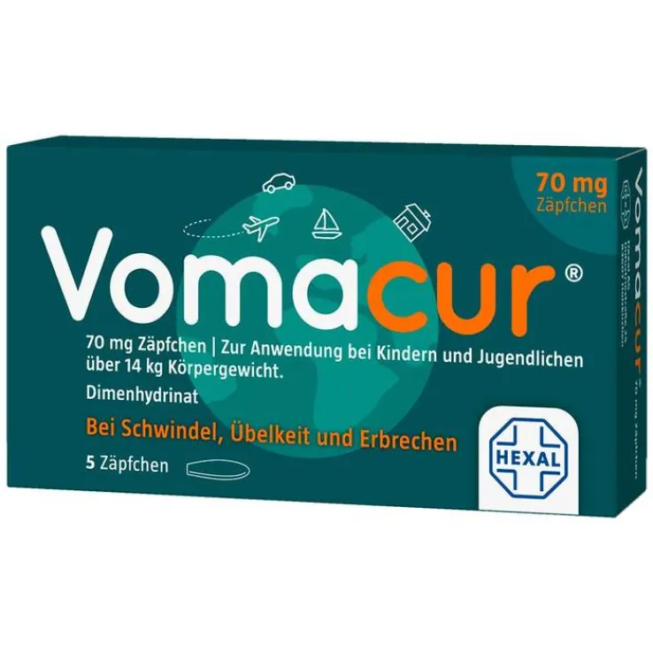 Vomacur® 70 mg Zäpfchen. Wirkstoff: Dimenhydrinat. Anwendungsgebiete: Zur Vorbeugung und Behandlung von Reisekrankheit, Schwindel, Übelkeit und Erbrechen. Zur Anwendung bei Kindern und Jugendlichen über 14 kg Körpergewicht. Hinweis: Dimenhydrinat ist zur alleinigen Behandlung von Übelkeit und Erbrechen im Gefolge einer medikamentösen Krebsbehandlung (Zytostatika-Therapie) nicht geeignet. Zu Risiken und Nebenwirkungen lesen Sie die Packungsbeilage und fragen Sie Ihre Ärztin, Ihren Arzt oder in Ihrer Apotheke. ! Mat.-Nr.: 2/51014506 Stand: Juni 2021. Hexal AG, 83607 Holzkirchen, www.hexal.de