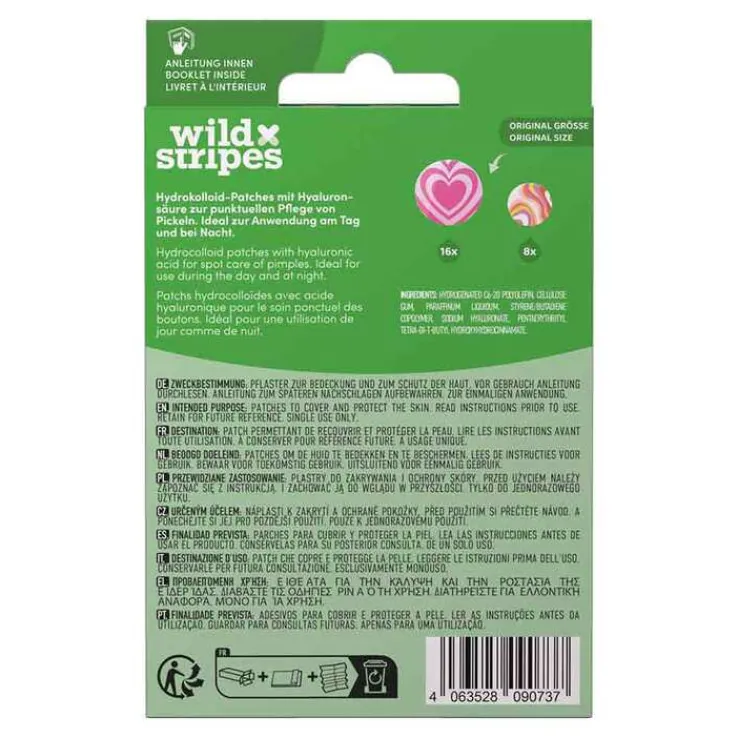 Die Wild Stripes Anti-Pickel Patches enthalten Hydrokolloid und Hyaluronsäure für gezielte Pflege und Feuchtigkeitsversorgung. Die Patches decken Pickel und Hautunreinheiten unauffällig ab , sind somit ideal für den Tag und die Nacht. Die Pflaster sind hautfreundlich, hypoallergen und sanft zur Haut.