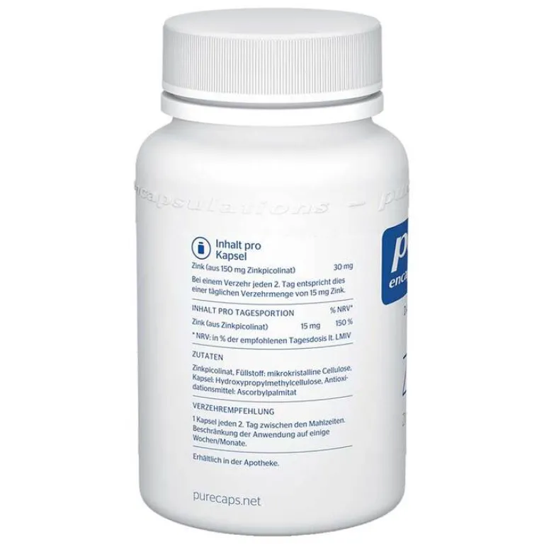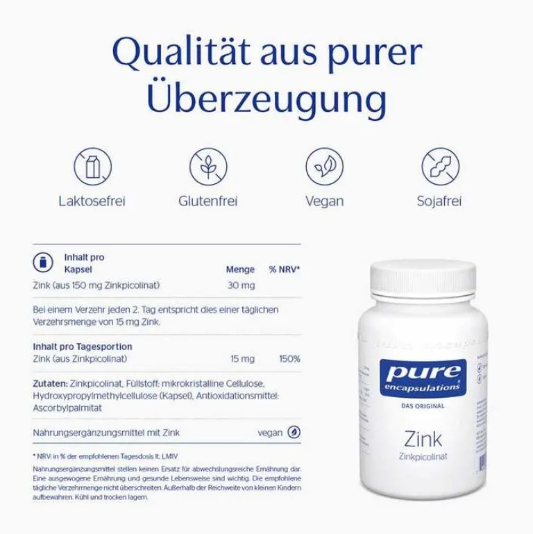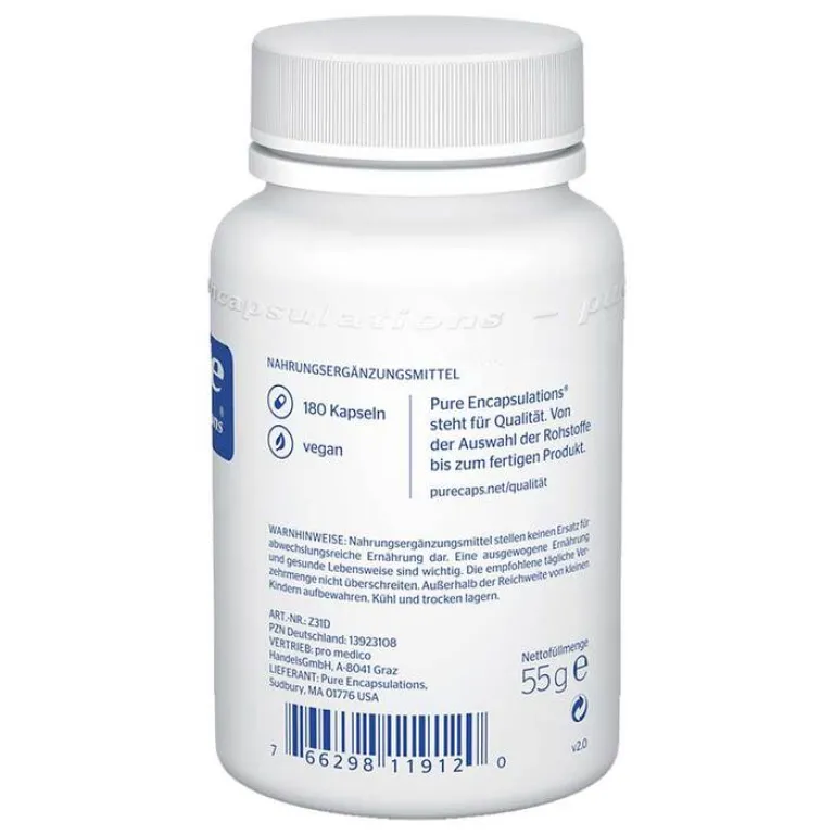 Zink 30 von Pure Encapsulations ist an Picolinsäure gebundenes Zink in Kapselform. Diese Zinkverbindung gilt als sehr gut verträglich und kann vom Körper leicht aufgenommen und verwertet werden, da Picolinsäure von Natur aus im Körper vorkommt. Die Kapseln eignen sich ideal zur Nahrungsergänzung bei einem höheren Tagesbedarf an Zink, etwa bei Rauchern, vegetarischer Ernährung oder als zusätzliche Unterstützung des Immunsystems.*