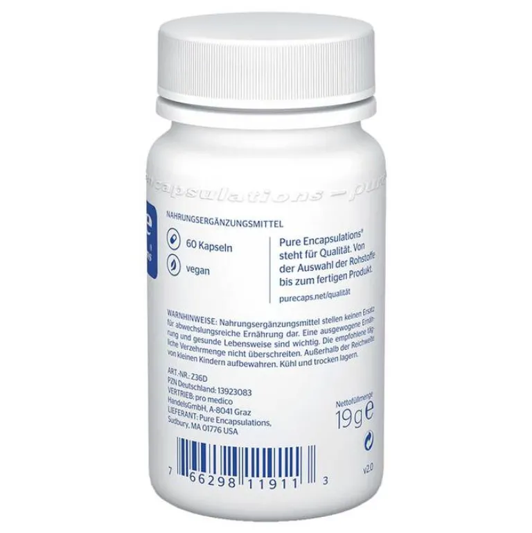 Zink 30 von Pure Encapsulations ist an Picolinsäure gebundenes Zink in Kapselform. Diese Zinkverbindung gilt als sehr gut verträglich und kann vom Körper leicht aufgenommen und verwertet werden, da Picolinsäure von Natur aus im Körper vorkommt. Die Kapseln eignen sich ideal zur Nahrungsergänzung bei einem höheren Tagesbedarf an Zink, etwa bei Rauchern, vegetarischer Ernährung oder als zusätzliche Unterstützung des Immunsystems.*