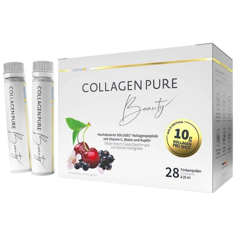 - Collagen Pure Beauty ist mit 10 g Kollagen Peptide pro Trinkampulle sehr hoch dosiert.
