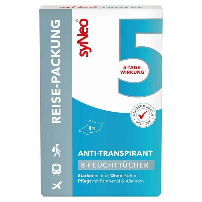 Der syNeo 5 Antitranspirant Reisepack eignet sich für Achseln, Füße, Gesicht und andere Körperregionen. Es sind 8 hygienisch verpackte Einzeltücher je 2,5 ml enthalten.