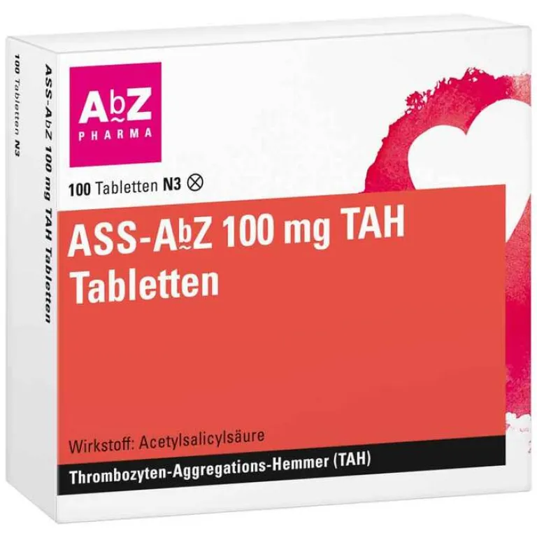 ASS-AbZ 100 mg TAH Tabletten.Wirkstoff: Acetylsalicylsäure. Anwendungsgebiete: Instabile Angina pectoris – als Teil der Standardtherapie, akutem Myokardinfarkt als Teil der Standardtherapie, Reinfarktprophylaxe, nach arteriellen, gefäßchirurg. od. interventionellen Eingriffen (z. B. nach ACVB, bei PTCA), Vorbeugung TIA u. Hirninfarkten, nachdem Vorläuferstadien aufgetreten sind. Hinweis: aufgrund niedriger Dosierung nicht wirksam b. Schmerzzuständen. Apothekenpflichtig. Zu Risiken und Nebenwirkungen lesen Sie die Packungsbeilage und fragen Sie Ihre Ärztin, Ihren Arzt oder in Ihrer Apotheke. 1/25. Zu Risiken und Nebenwirkungen lesen Sie die Packungsbeilage und fragen Sie Ihre Ärztin, Ihren Arzt oder in Ihrer Apotheke. 1/25.