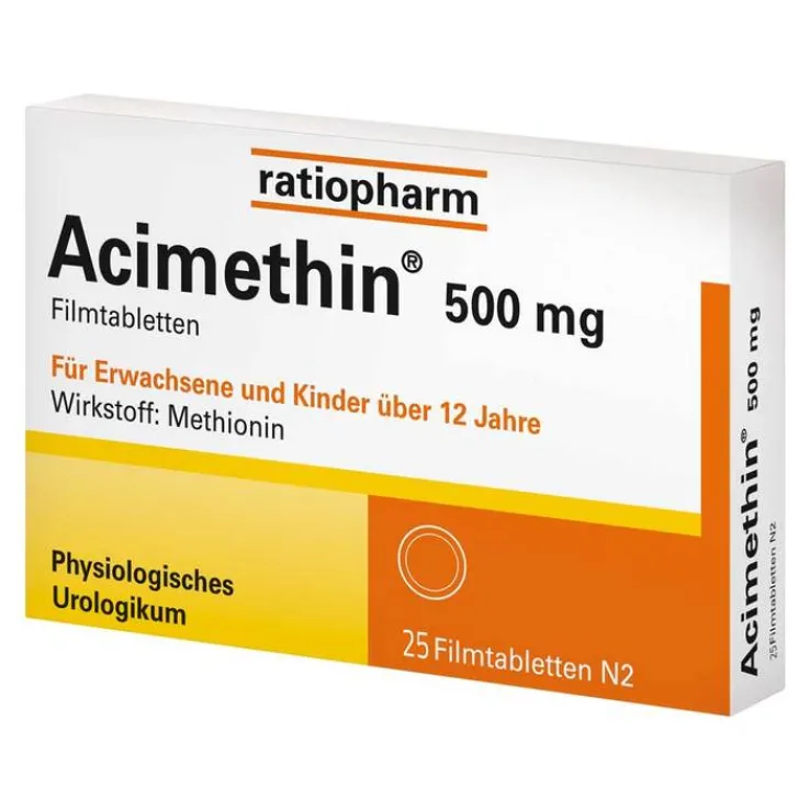 Acimethin® 500 mg Filmtabletten Wirkstoff: Methionin. Anwendungsgebiete: Als harnansäuernde Substanz: mit bakteriostatischer Wirkung bei Harnwegsinfektionen, auch zur Rezidivprophylaxe bei Patienten mit neurogenen Blasenfunktionsstörungen, zur Optimierung der Wirkung von Antibiotika mit Wirkungsoptimum im sauren Urin (pH 4-6): z. B. Ampicillin, Carbenicillin, Sulfonamiden, Nalidixinsäure, Nitrofurantoin, zur Vermeidung der Steinneubildung bei Phosphatsteinen (Struvit, Karbonatapatit, Brushit). Warnhinweis: AM enth. weniger als 1 mmol (23 mg) Natrium pro Filmtbl., d. h., es ist nahezu „natriumfrei“. Apothekenpflichtig. Zu Risiken und Nebenwirkungen lesen Sie die Packungsbeilage und fragen Sie Ihre Ärztin, Ihren Arzt oder in Ihrer Apotheke. 1/21. Zulassungsinhaber: ratiopharm GmbH, Graf-Arco-Str. 3, 89079 Ulm.