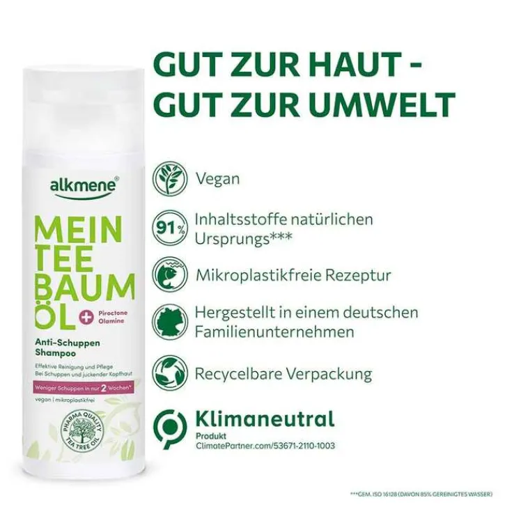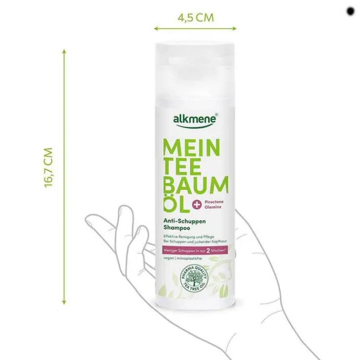 Das alkmene MEIN TEEBAUMÖL Anti-Schuppen Shampoo mit der einzigartigen Wirkkombination aus Teebaumöl und Piroctone Olamine lindert Juckreiz, reduziert nachweislich Schuppen und beugt deren Neubildung vor.