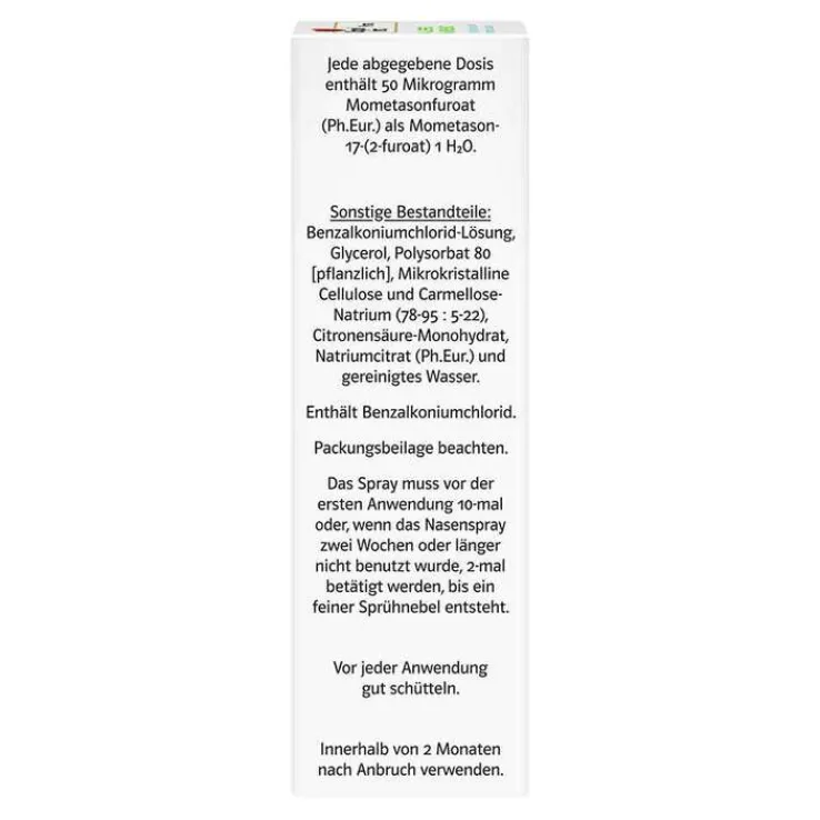 ALLERGO-MOMELIND 50 Mikrogramm/Sprühstoß Nasenspray, Suspension. Wirkstoff: Mometasonfuroat (Ph. Eur.). Anwendungsgebiet: Zur Anwendung bei Erwachsenen zur symptomatischen Behandlung der Beschwerden eines Heuschnupfens (saisonale allergische Rhinitis), nach der Erstdiagnose eines Heuschnupfens (saisonale allergische Rhinitis) durch einen Arzt. Warnhinweise: Enthält Benzalkoniumchlorid. Zu Risiken und Nebenwirkungen lesen Sie die Packungsbeilage und fragen Sie Ihre Ärztin, Ihren Arzt oder in Ihrer Apotheke. Stand 06/2021