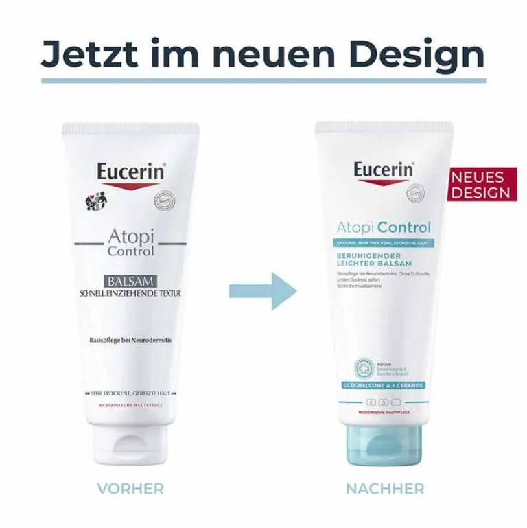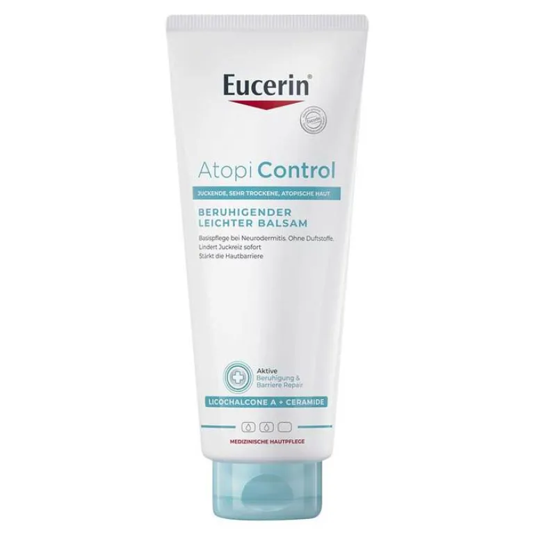 Trockene und gereizte Haut sowie zu Neurodermitis neigende Haut benötigt intensive Pflege und besondere Zuwendung. Die Wirkstoffe des Eucerin AtopiControl Balsam bieten eine gut einziehende und leicht zu verteilende Ganzkörperpflege für die tägliche Anwendung.