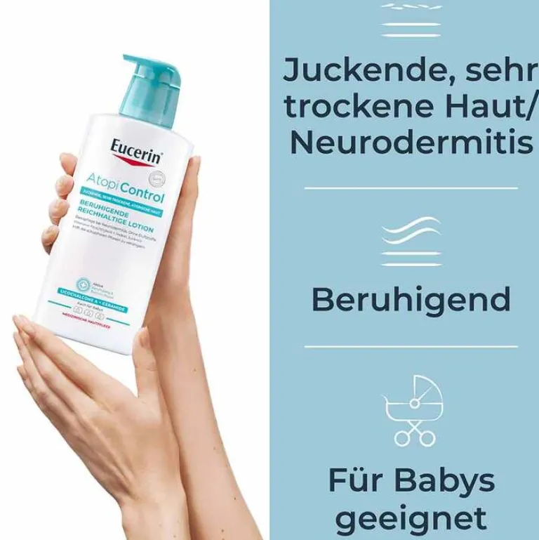 Die Eucerin AtopiControl Lotion ist eine schnell einziehende und beruhigende Bodylotion. Sie eignet sich zur Anwendung während eines akuten Neurodermitisschubs oder zur täglichen Hautpflege. Die feuchtigkeitsspendende Wasser-in-Öl-Lotion beruhigt atopische Haut und sorgt für ein spürbar geschmeidiges Hautgefühl.